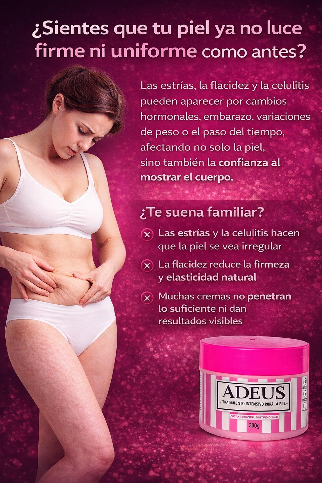 Sí. ADEUS fue formulado pensando en mujeres con cambios hormonales, de peso o postparto. Sus ingredientes ayudan a mejorar la apariencia de estrías y a reafirmar zonas como abdomen, piernas y brazos.
